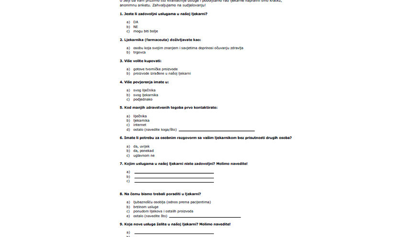 U želji da Vam pružimo što kvalitetnije usluge i poboljšamo rad Ljekarne napravili smo kratku, anonimnu anketu, koju možete preuzeti s naše stranice (snimite fotografiju s lijeve strane na svoje računalo). Ispunjenu anketu nam dostavite u Ljekarnu ili pošaljite na mail: info@ljekarna-ceric.com. Zahvaljujemo na sudjelovanju!