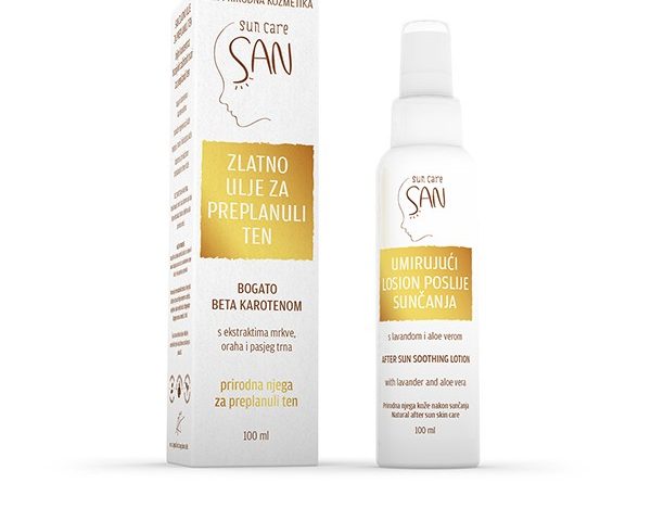 NAMJENA: SAN SUN CARE Zlatno ulje za preplanuli ten je prirodna njega za postizanje preplanulog tena te za prehranu i obnovu kože. SAN SUN CARE Umirujući losion poslije sunčanja pomaže pri hidrataciji, obnovi i umirenju kože nakon izlaganja suncu.